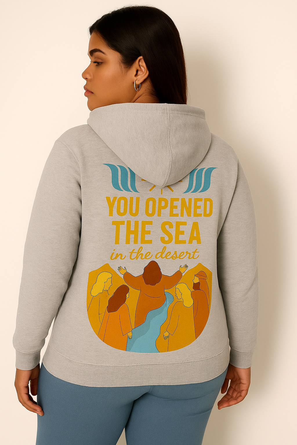 The "You Opened the Sea" hoodie embodies faith that moves mountains and parts waters-a symbol of walking in purpose, even when the path seems closed. Inspired by the moment God made a way though the sea, this piece captures courage, surrender, and trust in His plan.